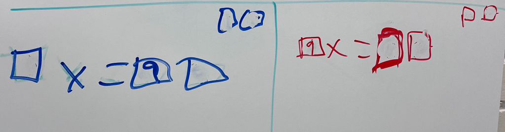 One of the reasons I love this game is because it provides meaningful practice and also encourages students to “look for and make use of structure.” (SMP7) As someone who has had a wide variety of experiences with linear equations, I can parse the equation, and see meaningful chunks. If we ignore the addition in there, ❒ = ❒ ❒ for a value of