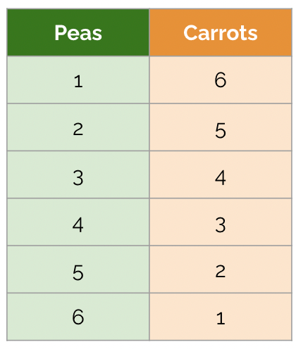 So a total of 6 items, with some peas, some carrots, and some beans, results in the same number as .