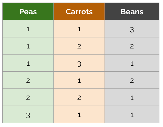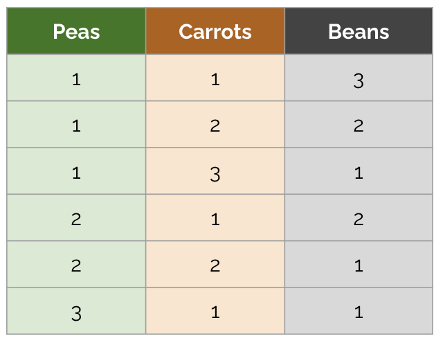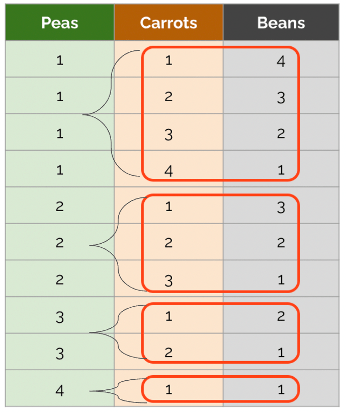 There are 4 combinations that start with 1 pea. That’s because there are 6 total items, and with exactly one of them known to be a pea, we have 5 unknown items remaining. Assuming that there have to be at least one pea, at least one carrot, and at least one bean, this yields , or