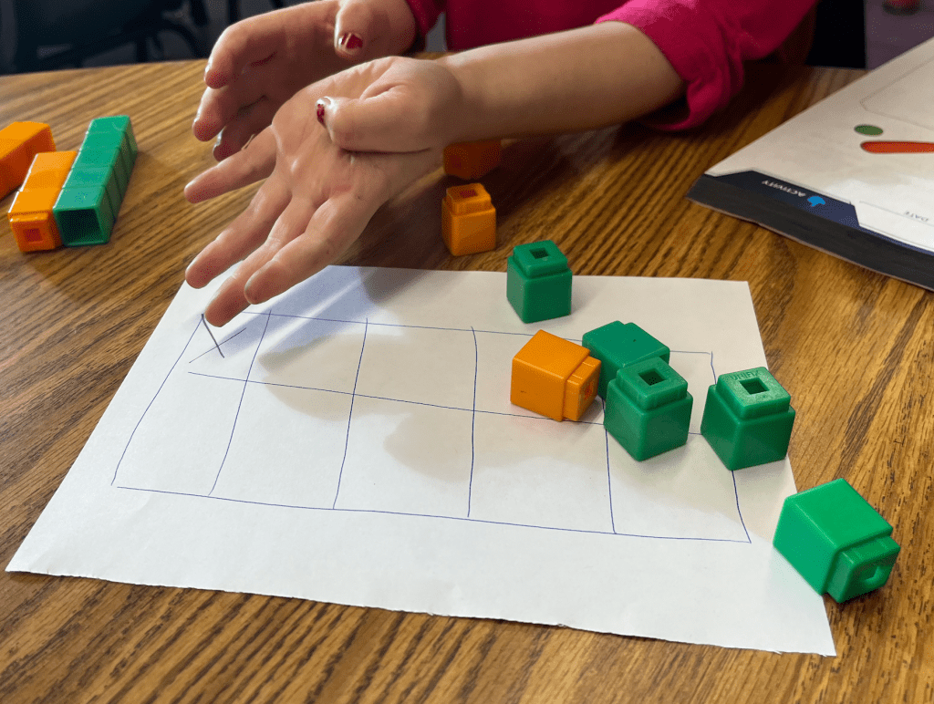 The teacher, Rachel, signaled to get the classes attention, and let them know that they could stretch their thinking with the group at the back. “Challenge your brain to figure out what happens when we add in beans.”
