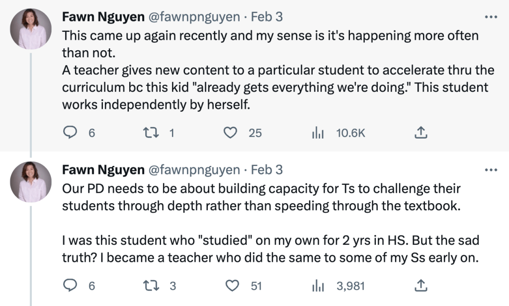 There are also cases where I feel like acceleration just makes sense. In fact, I used to teach an accelerated cohort within my school of elementary school students doing middle school math in a serious and comprehensive way. There are, of course, major issues around equity and access with acceleration, but that doesn’t mean that it’s never appropriate.