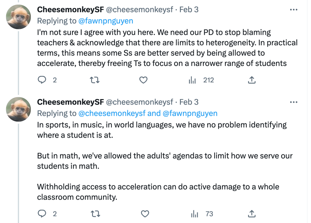 Meanwhile, @cheesemonkeysf wrote about the need to acknowledge the limits of (and challenges with) heterogeneity, and that some students are better served by being allowed to accelerate.