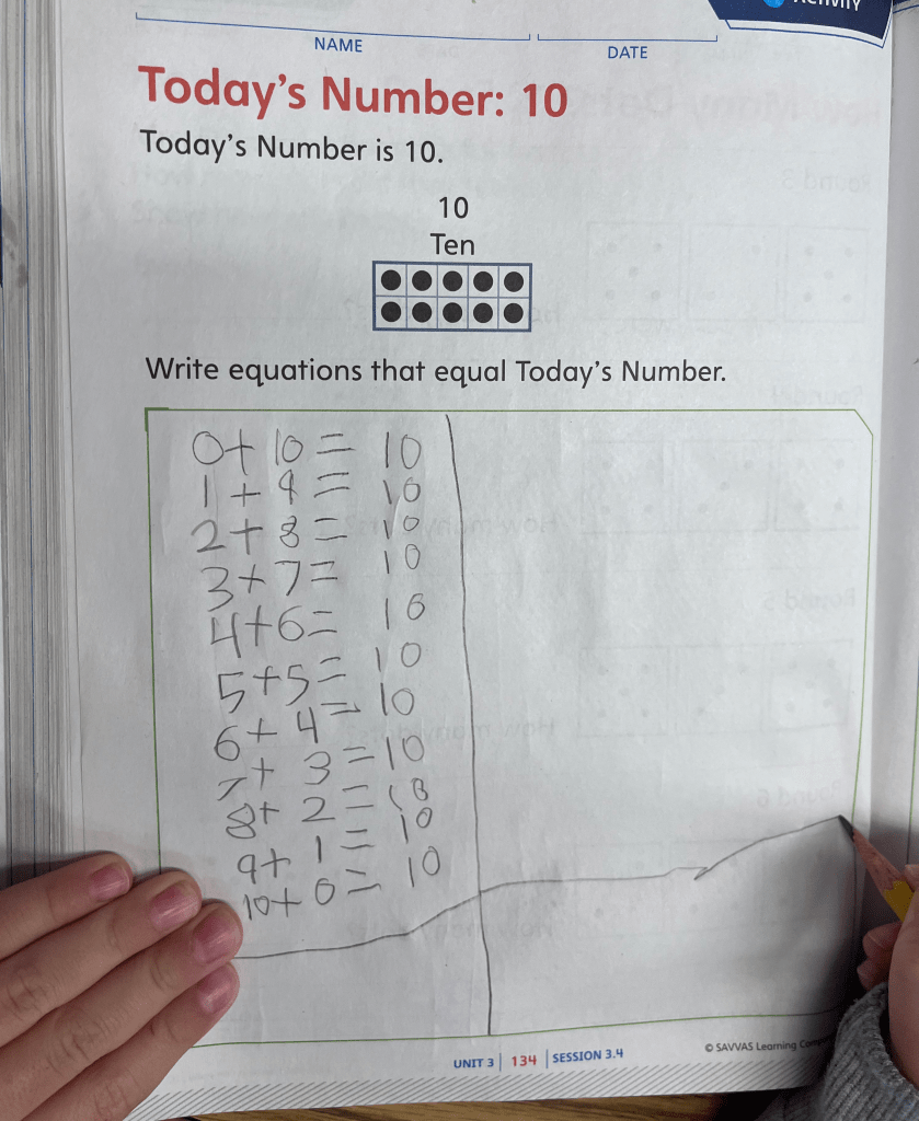 In a recent “Number of the Day” activity (Investigations Math), students brainstormed ways to make the number 10. I saw all sorts of solutions: some using addition, some using subtraction, some incorporating both operations.