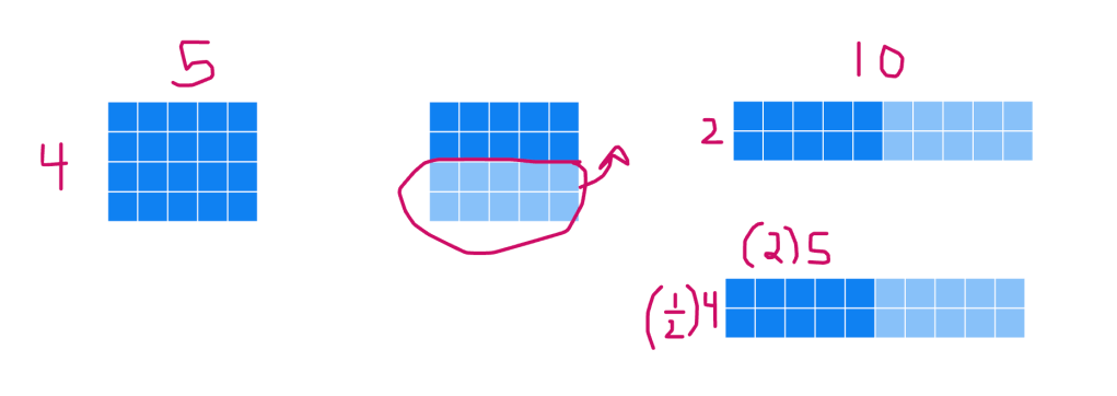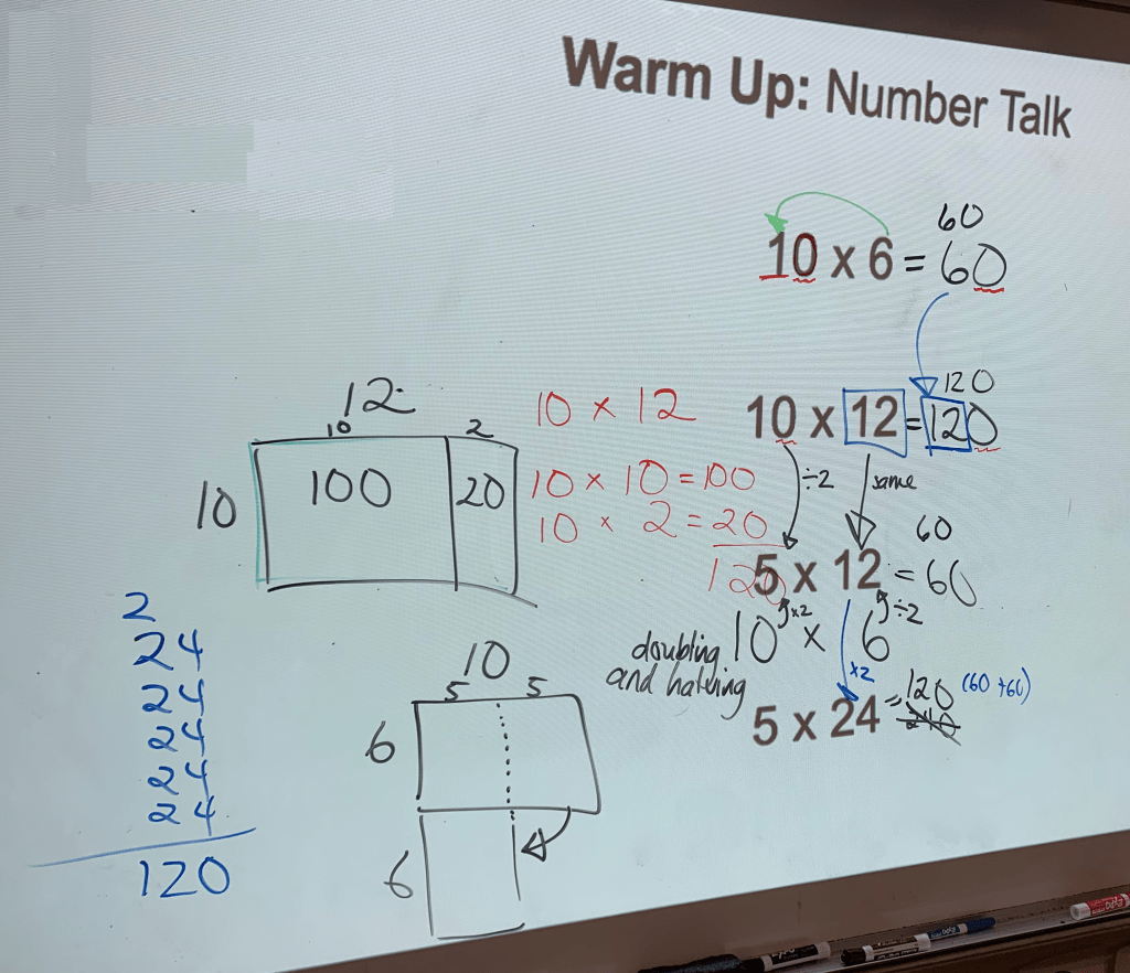 This is a record from a fourth grade number talk. It moves slowly through the doubling and halving, adjusting one factor at a time. Students can see that 5 x 12 is half of 10 x 12, because it’s half as many groups. And then 5 x 24 is double 5 x 12 because there’s twice as many groups.