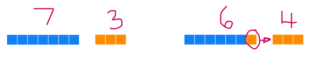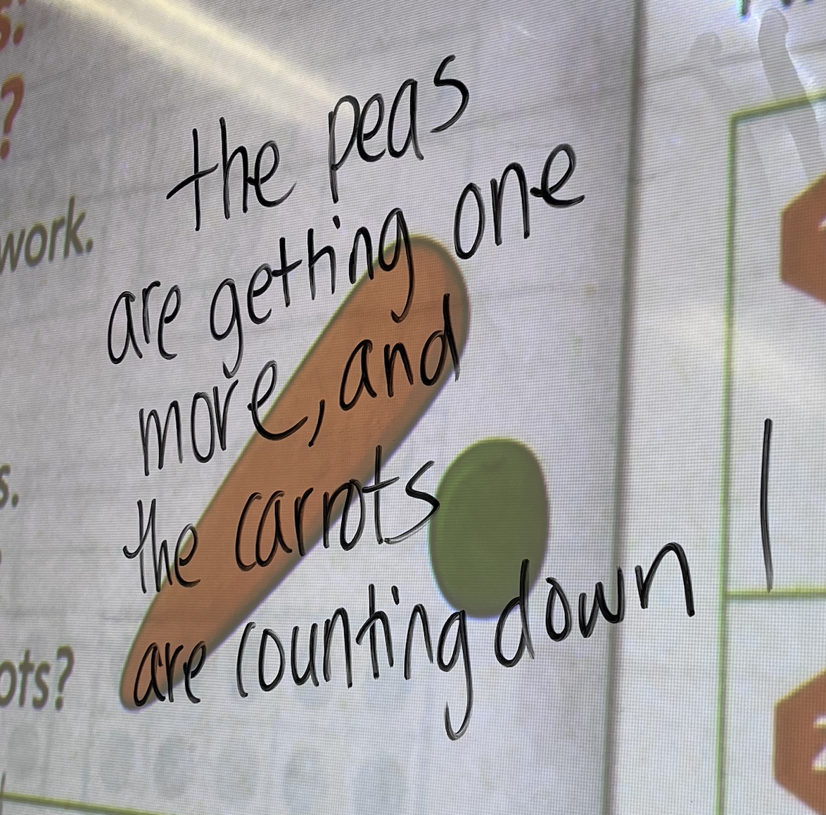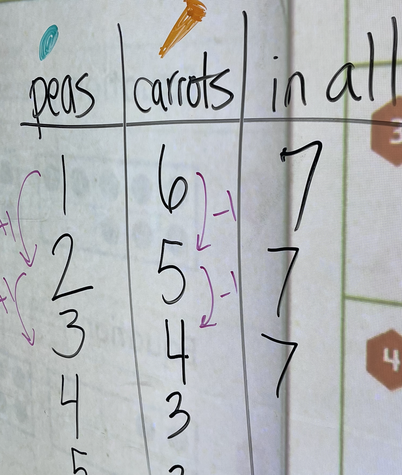 This idea had surfaced several times during our work on part-part-whole, how many of each problems (e.g. there are 7 vegetables: some are peas, some are carrots). One student had articulated this as “The peas are getting one more, and the carrots are counting down.” It’s an astute observation, but not yet at the point of a generalization.