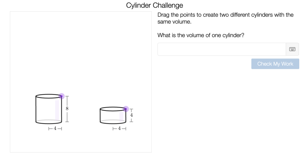 Late in the lesson, students were asked create two different cylinders with the same volume. Which to say: we will use the same formula, but different values for the radius and the height, and preserve the equality.