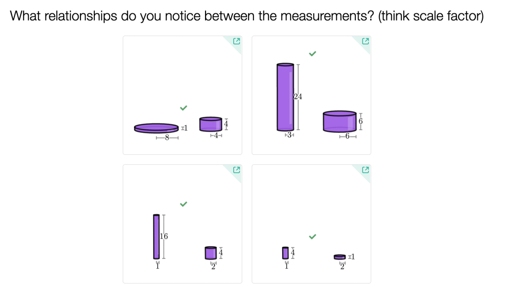 Many students messed around with it, using the “check my work” function to adjust and revise their work. To anchor them on our thinking about the relationship between these variables, and preview a little bit of Monday’s lesson (“Scaling Cylinders with Functions”), I used a few student work samples that showed successful pairings of cylinders with the same volume.