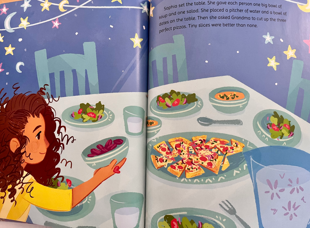 In the book, a young girl named Sophia wants to help her grandmother prepare the iftar (the meal that breaks the fast) for their family. They had made 5 individual pizzas: one for each member of the family. It seemed like the perfect plan, until…
