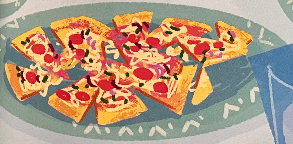 “I couldn’t stop wondering about this page,” I confessed. “I wonder if everyone got a fair share, and how they decided how many slices to cut each pizza into…”