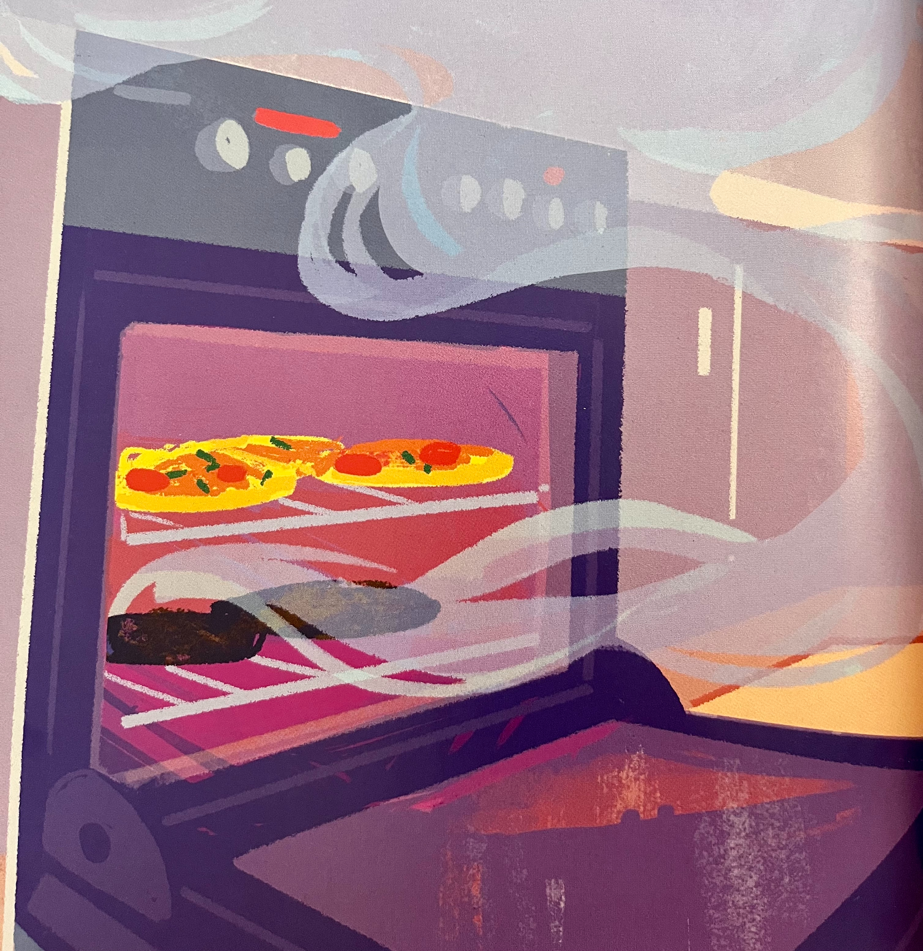 When the oven buzzed, Sophia jumped up from her chair. The pizzas were finally done. But when Grandma opened the oven, smoke billowed out.