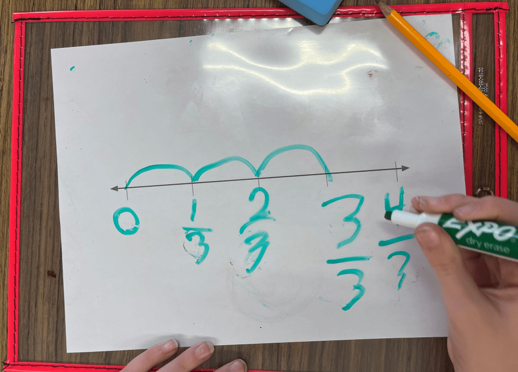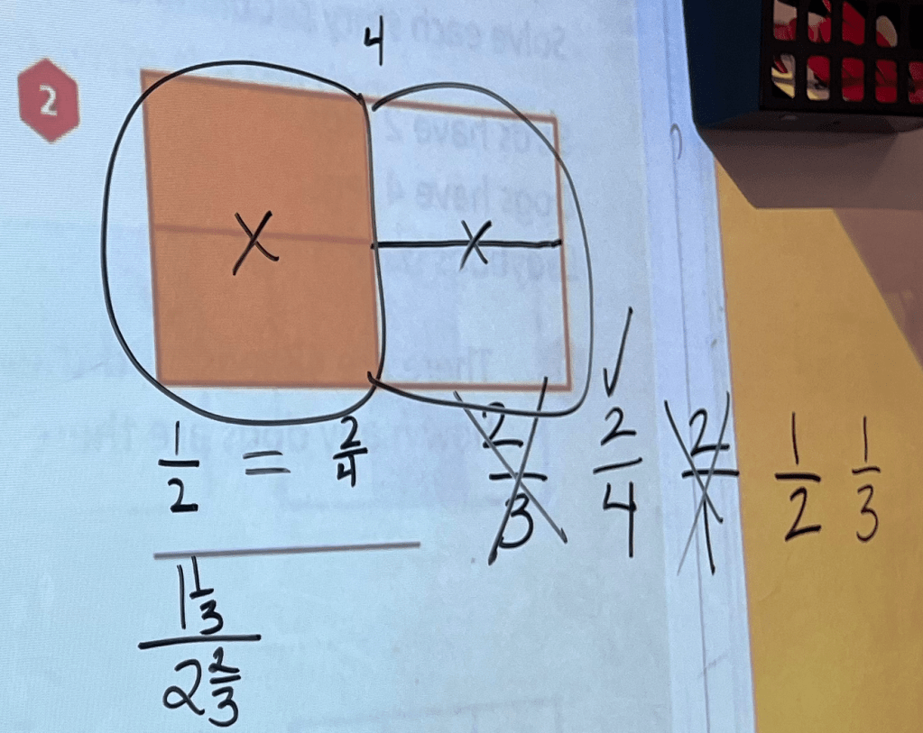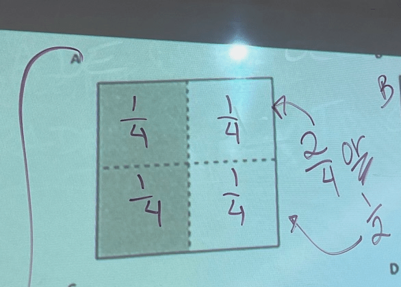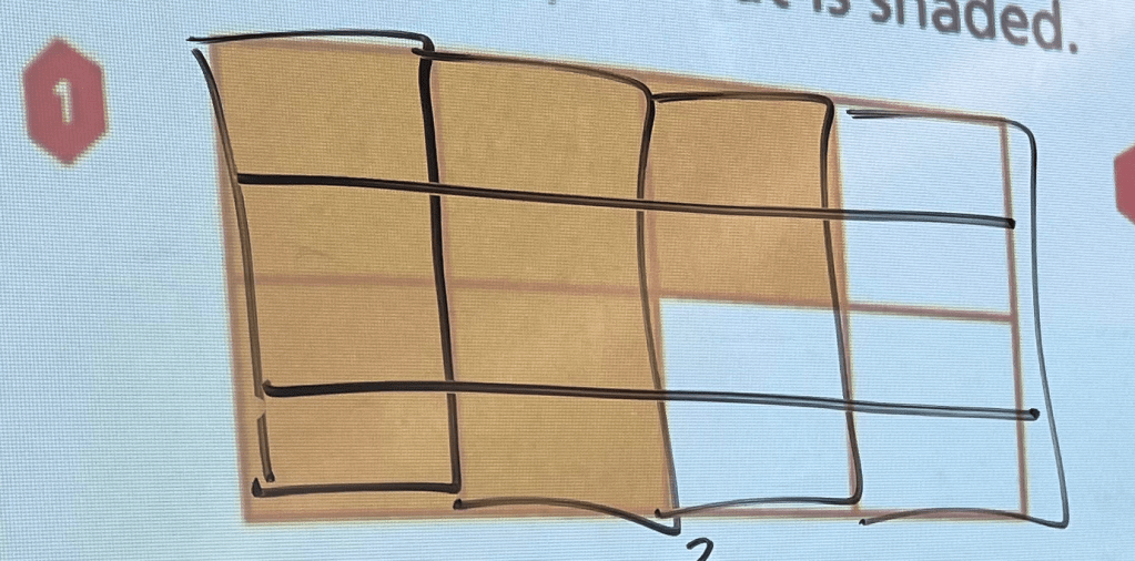We pushed the students to show each fraction in the diagram. Students came up to the board to show their evidence. Where do we see ? How about