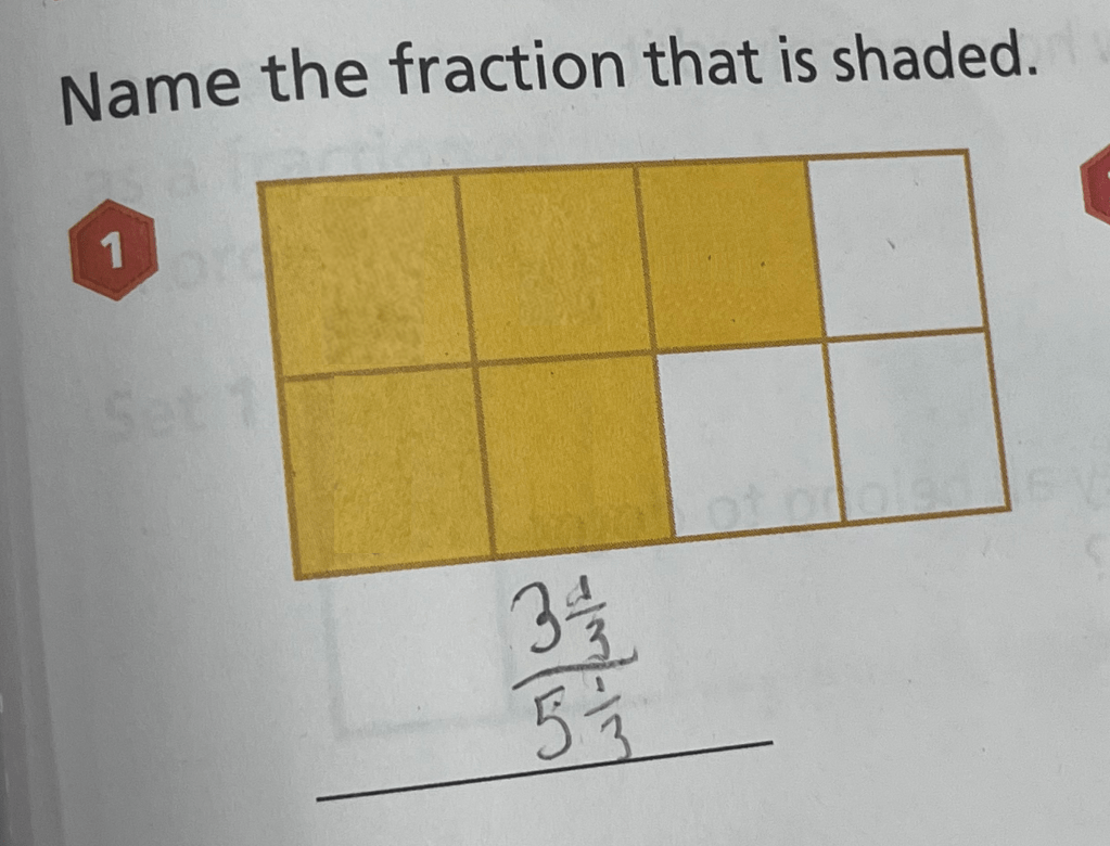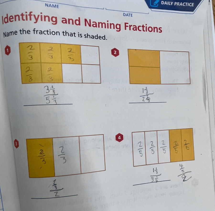 Then, we used a page in the Investigations workbook that had been marked for daily practice in a previous lesson. It showed several rectangular models for fractions, and asked students to name the fraction.