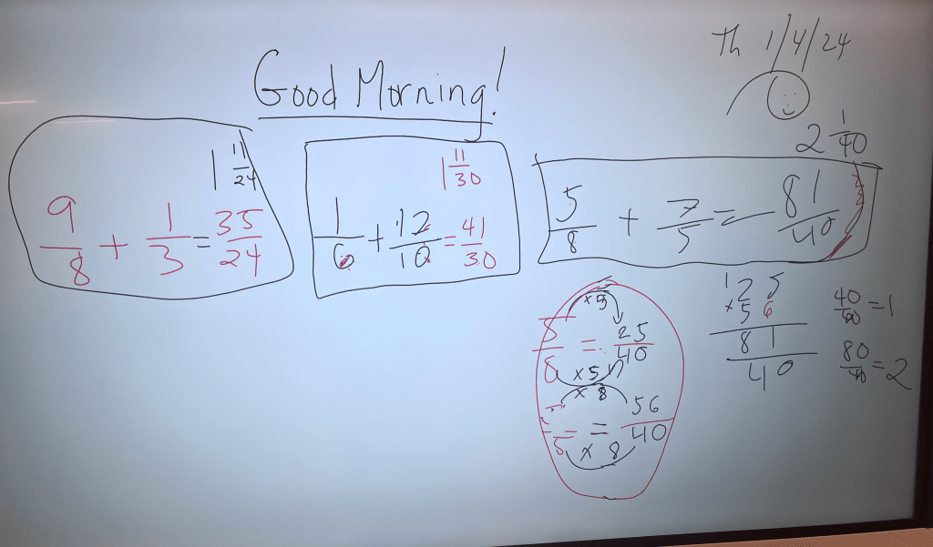 I wrinkled my nose. “Oh, yeah, these numbers are hideous!” There’s something about degrading the numbers: it makes students laugh, but also seems to increase buy-in. They’re validated but suspicious. Like, “oh, good, we can all agree that we want nothing to do with this problem. So why are we still going… this lady has a lot of tricks up her sleeves.” Just kidding. Fifth graders in 2024 do not use phrases anything like “tricks up her sleeves.” Have you even met a child? All the same, the way that they narrow their eyes speaks volumes.