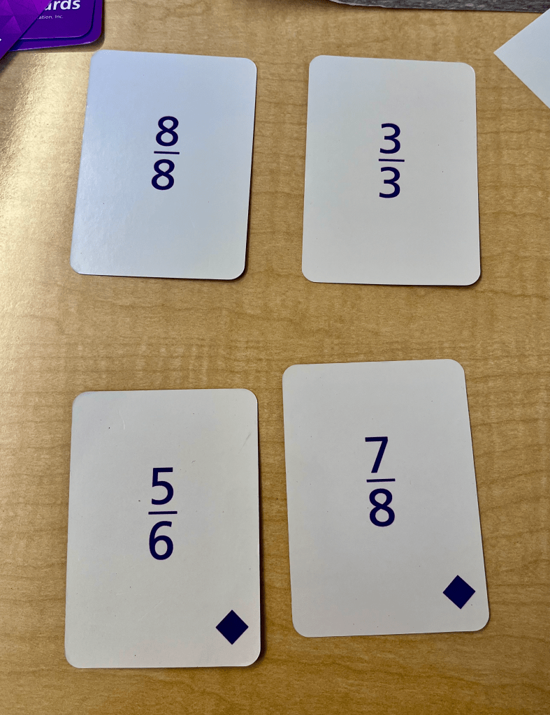 When the numbers were hideous, of course. And none of these fraction cards are truly hideous. (All numbers are beautiful!) What made them less appealing was their incompatible denominators, that required us to find common denominators. Often, these common denominators are not as easy to hold in our heads for mental math. Students need to know how to do this! I want every single one of those fifth graders able to add fractions with unlike denominators consistently, accurately, and efficiently. I don’t want them to shy away from those hideous denominators.