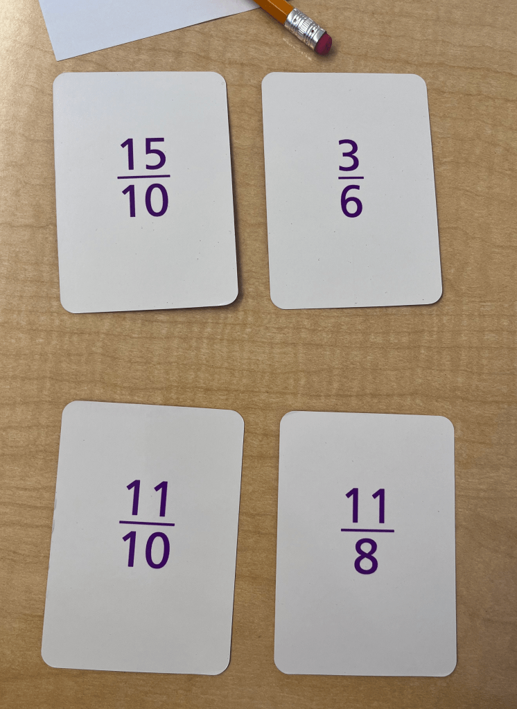 Students agreed that they used reasoning when they could compare a fraction (or the sum) to a benchmark, like knowing that they were both greater than one. Students were also more likely to use reasoning when their fraction card was equivalent to a landmark number, like how .