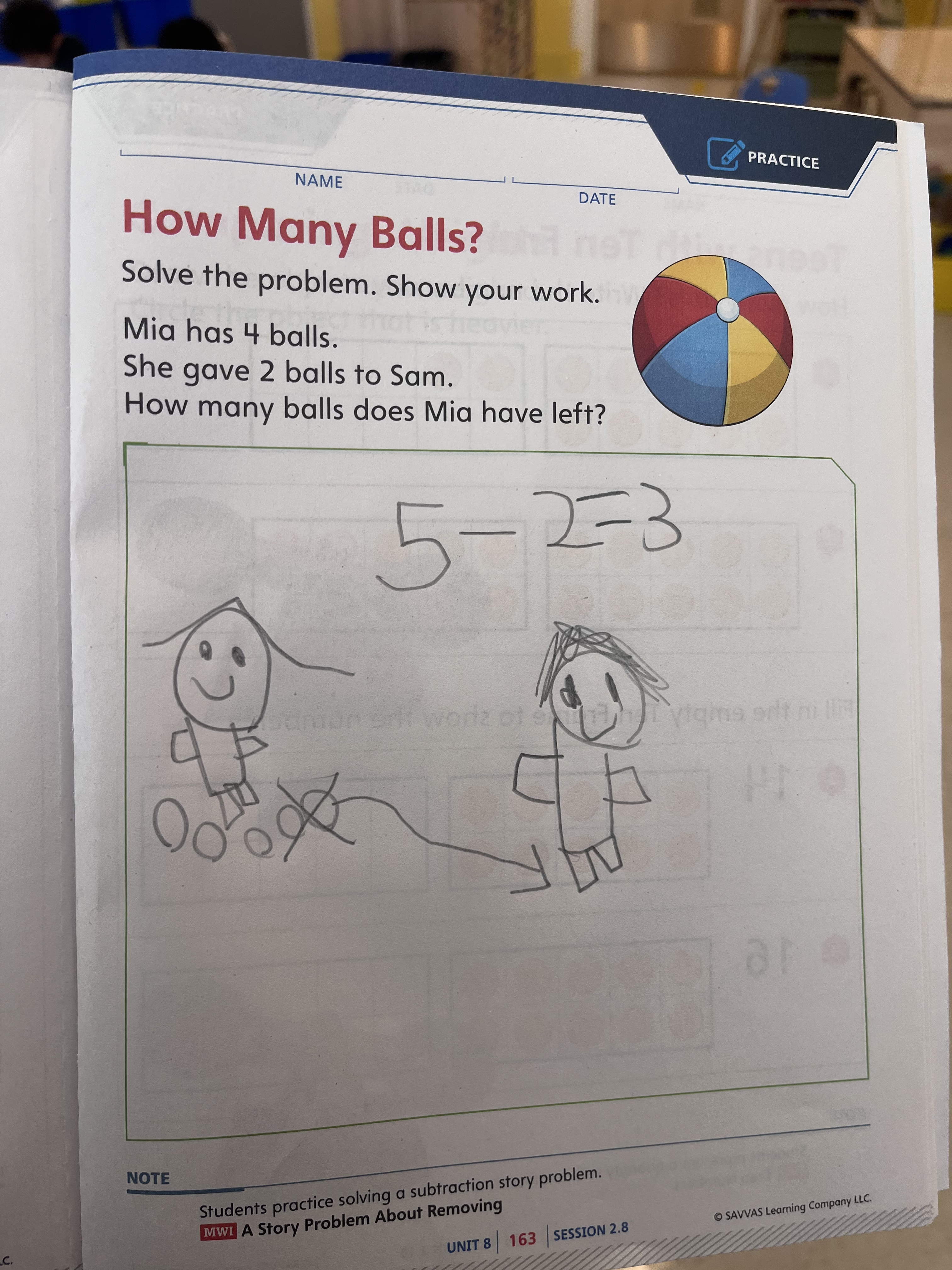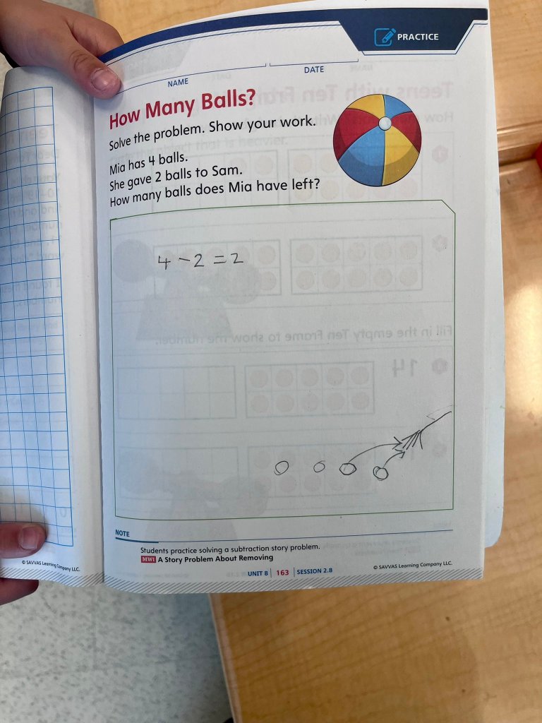 “I spoke with four of you about showing your work. Some of you drew the action of Mia giving the balls to Sam. Some of you drew what it looked like after Mia gave the balls to Sam. Let’s see how their pictures match the number sentence 4 – 2 = 2.”
