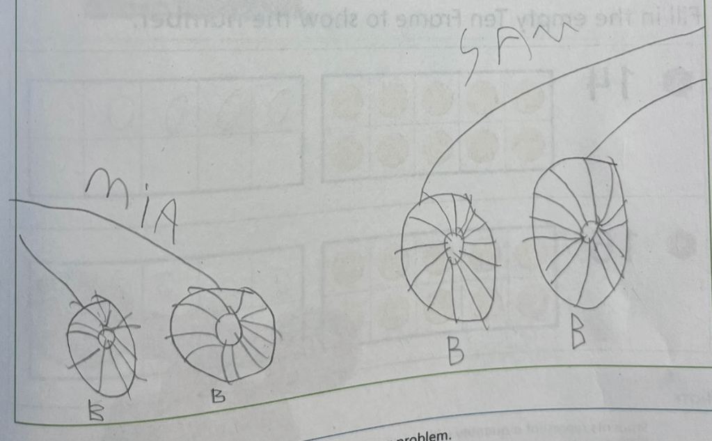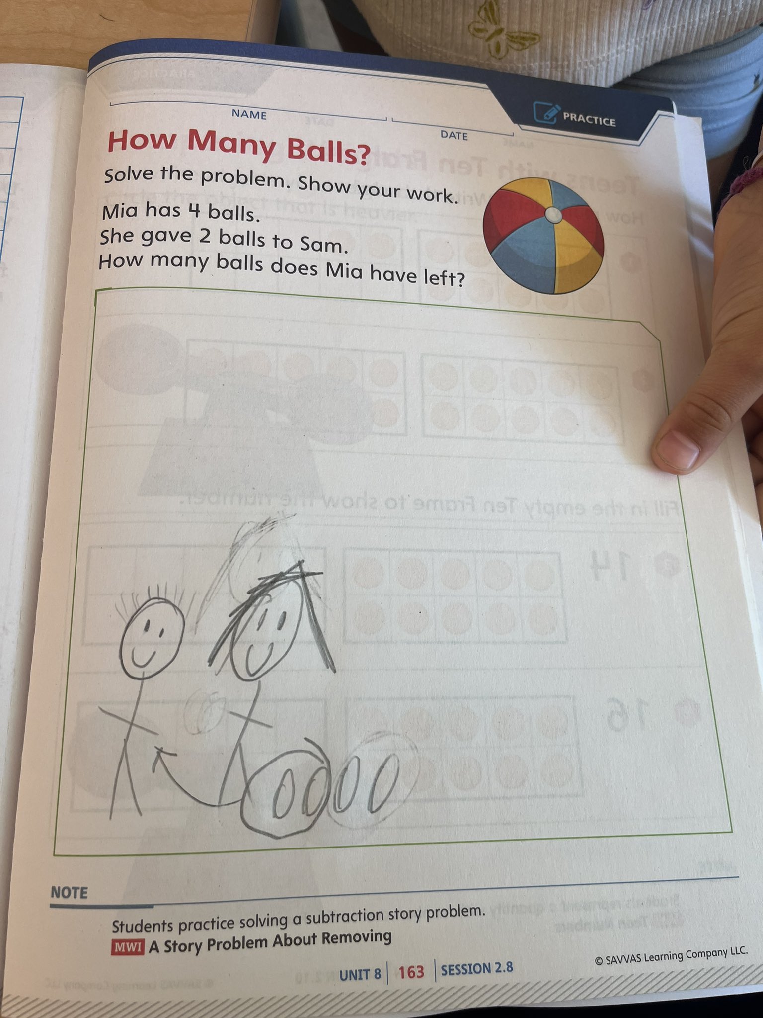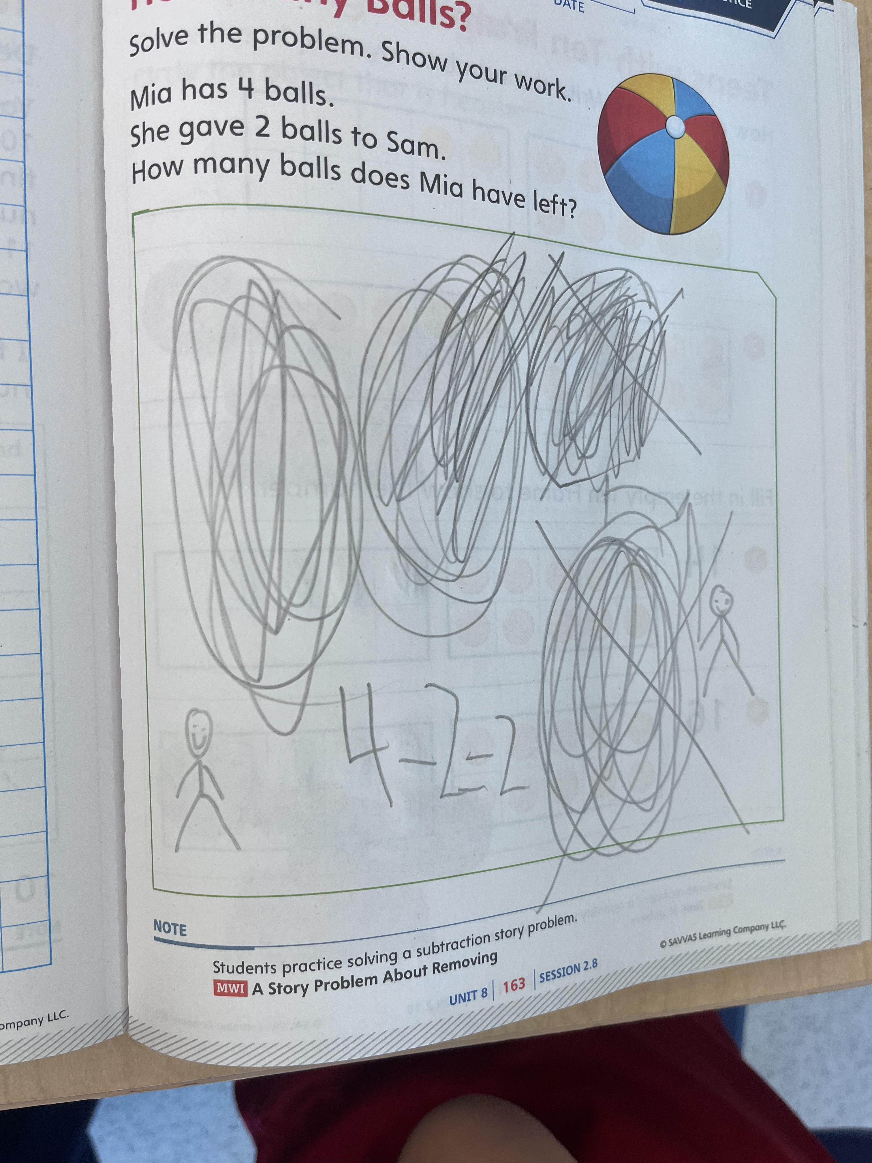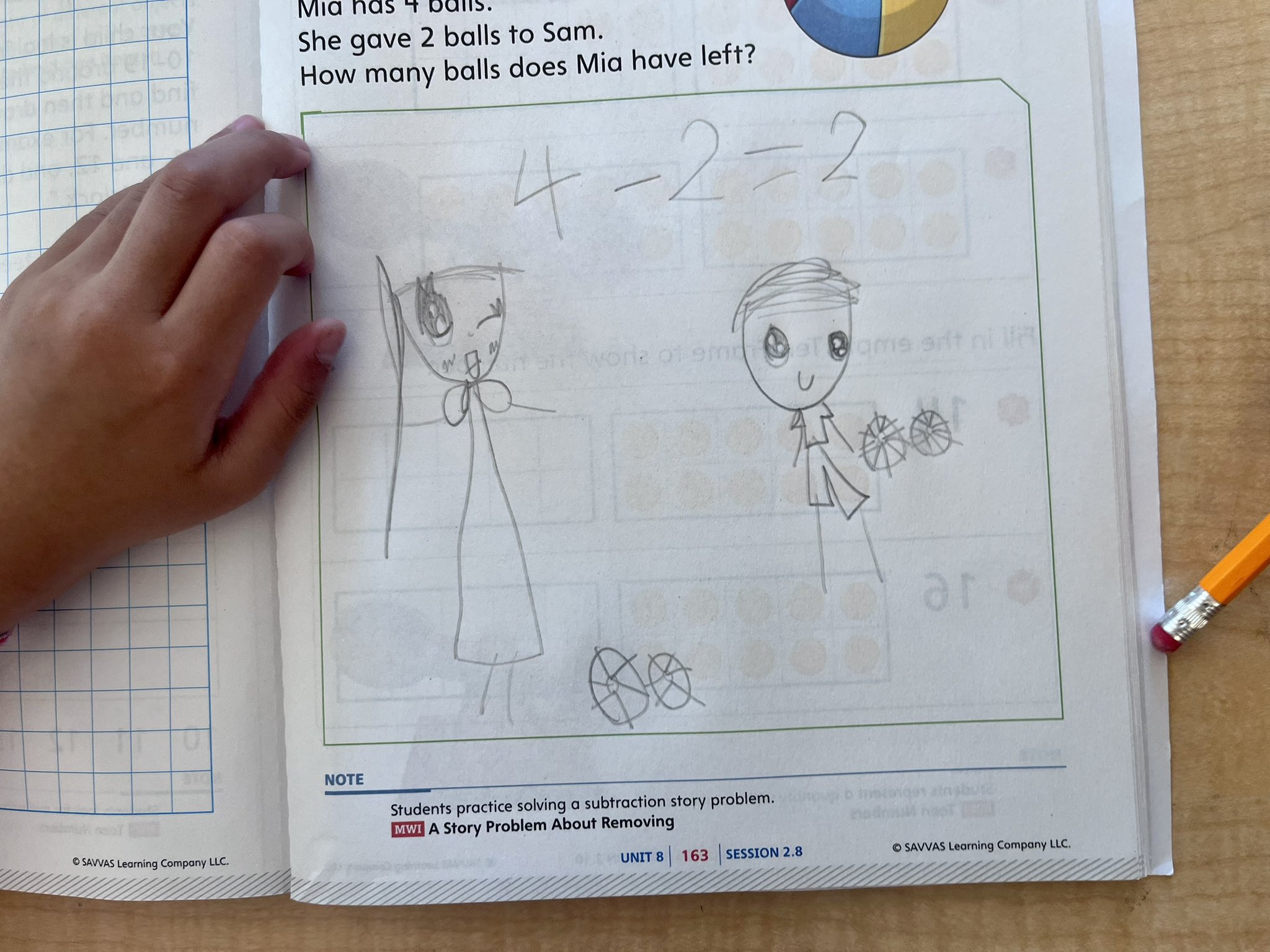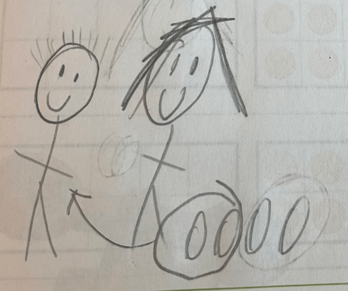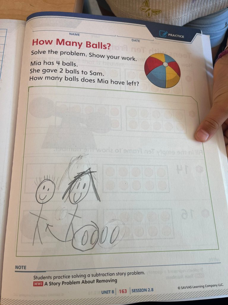 Maxim’s drawing didn’t match the quantities given in the story, but the way he showed the action was beautiful. Here we can see Mia on the left, with all of her balls. (I know.) I think she’s denoted with longer hair. (My best guess is that Maxim made some assumptions about gender based on the names, and also about gendered hair styles, but I could be wrong!) Two balls are circled, with an arrow indicating a transfer of ownership to a humble and grateful Sam. (I don’t just overanalyze the gender of these stick figures.) Maxim added in an equation: 5 – 2 = 3.