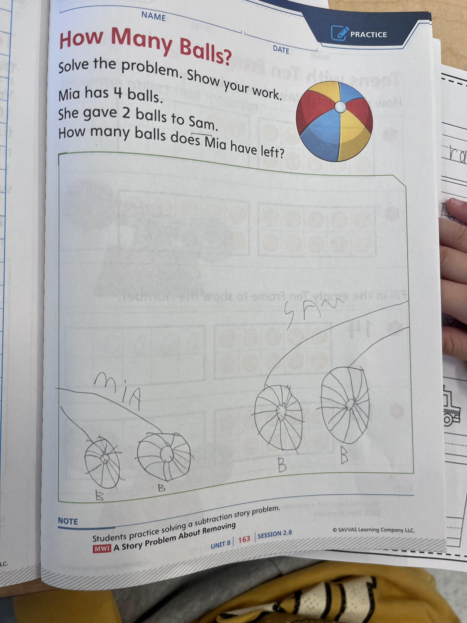 Peter’s work featured similar hairstyle assumptions and a similar arrow to show that Mia gave two of the balls to Sam. This time, they were circled instead of crossed out. It looks like Peter initially circled Mia’s remaining two, but made the decisions to erase that ring, so that the circle just shows the action.