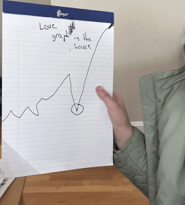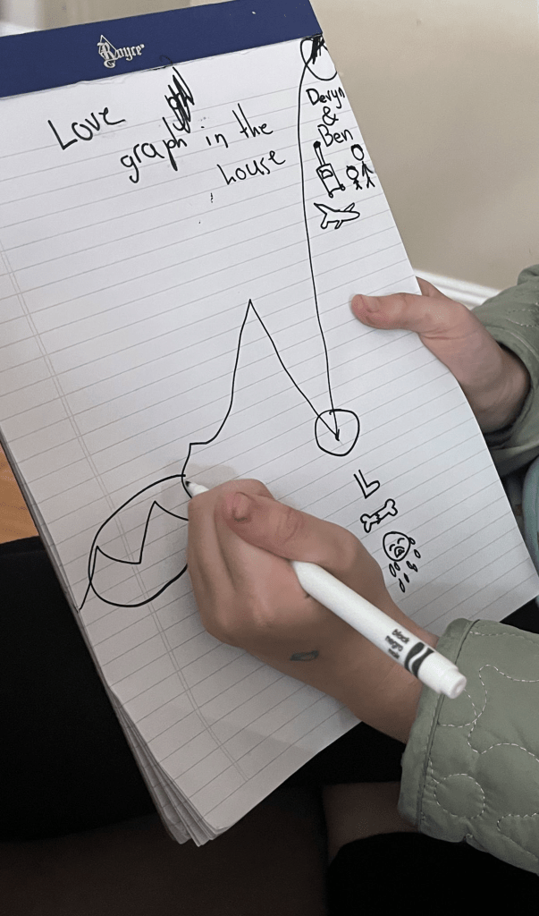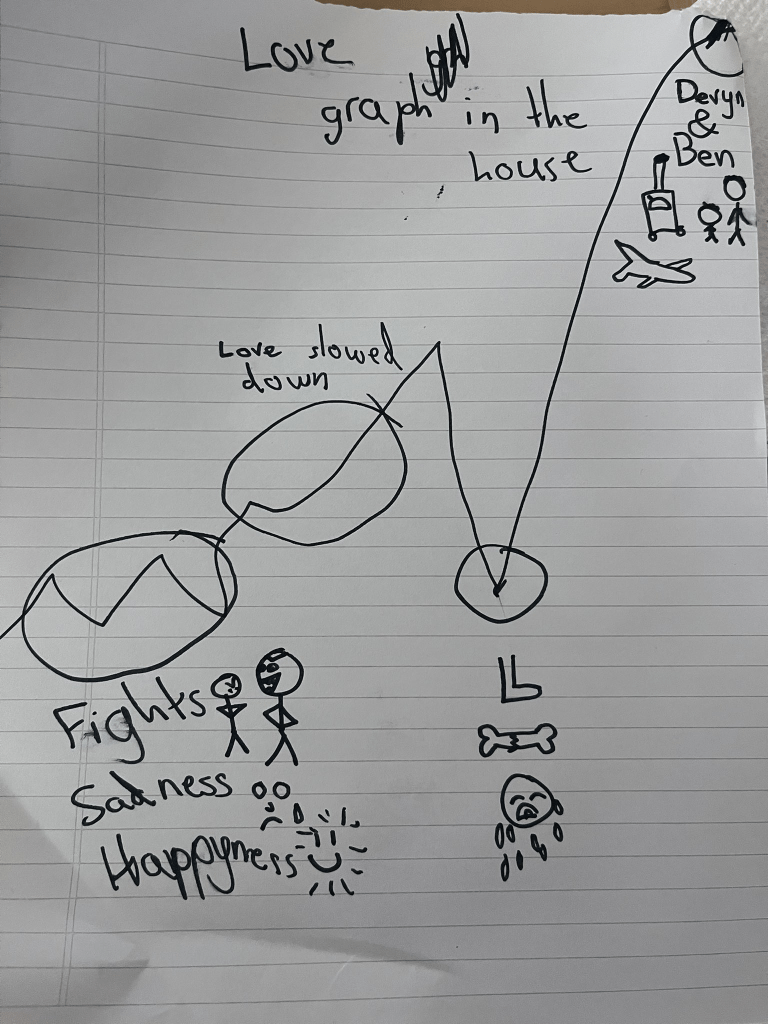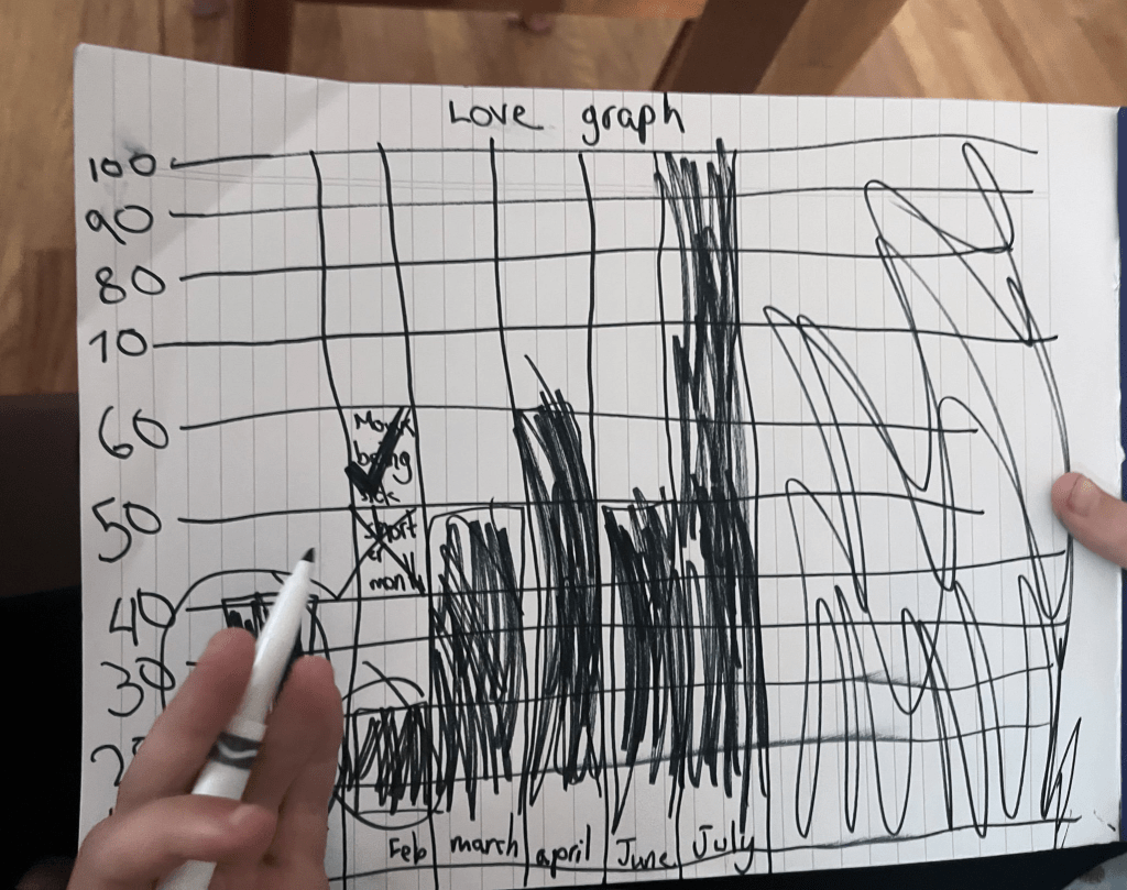 She then tore off the page — a big flourish! — and drew a third graph. She labeled it “Sadness graph + grumpyness + anger & fights.” It was the inverse fo the love graphs.