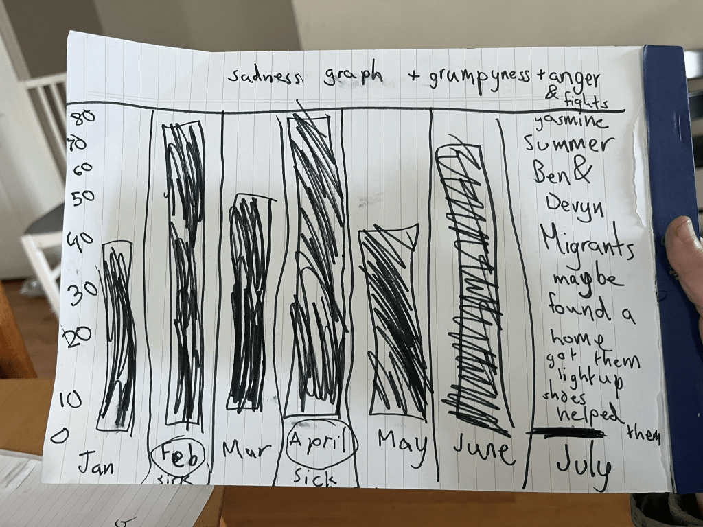 S returned the pad of paper to her lab, and drew several icons below the low point: a foot, a broken bone, and a crying face. My 6yo had broken his foot a few days earlier. I sent S to swim at a local pond with her cousin and uncle while I took my son to the urgent care. She was devastated to learn that it was broken, and that she wasn’t there to support him. (He seemed fine.)