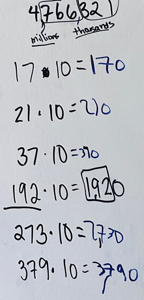 “1,920 is 192 tens,” I added. This wasn’t my most eloquent explanation, but I was nervous that more language would thin out the mathematical thread we were working on. I considered drawing a place value diagram and showing shifting place value, but instead I focused on the no-frills version we had right now. We had more content to address later in the session.