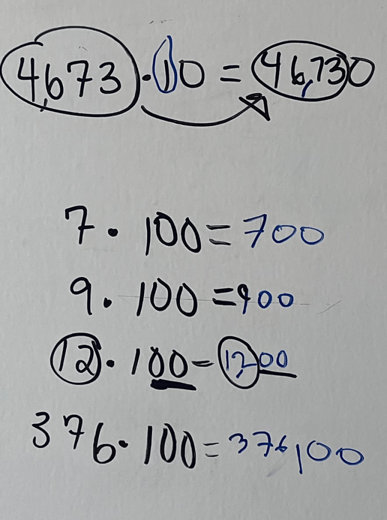 But first, we’d quickly touch on multiplying by a multiple of 10: one hundred. He quickly caught onto the pattern. We would continue to work on place value concepts in future sessions — I recorded it in my notebook — but, for now, we would continue to scale towards sixth grade content.