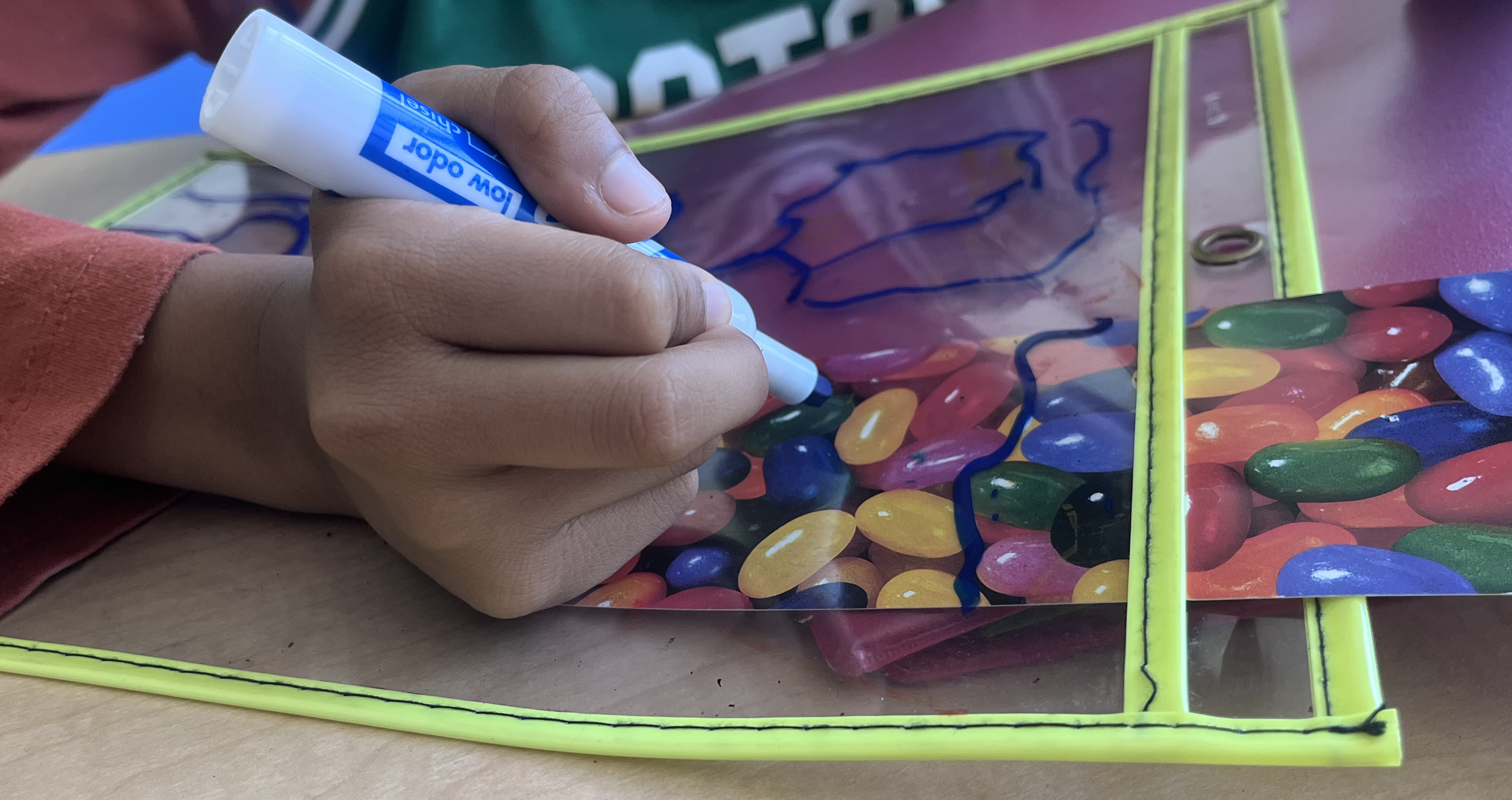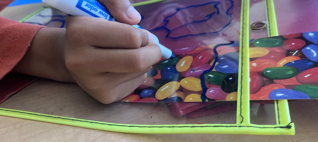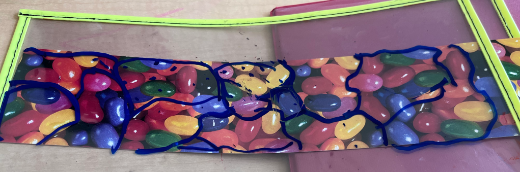 Eventually, he had to rotate the image — part of it had been hanging over the edge of the dry erase pocket, and he wanted to be able to annotate on it. After circling as many groups as he can, he pointed to the final 3 jellybeans. “I still have these.”