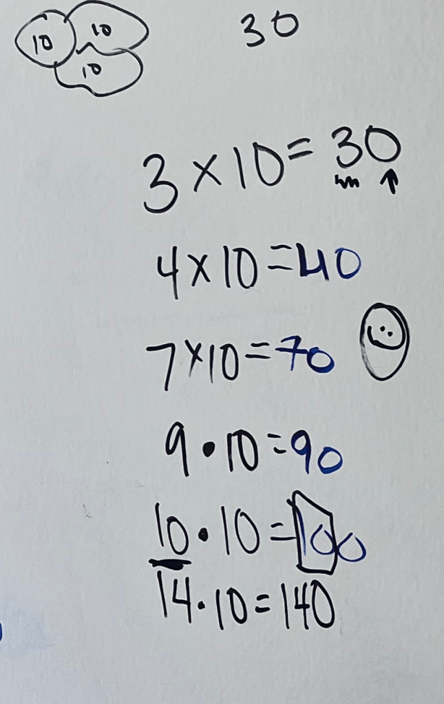 He recorded the 100, and I asked him to look for a pattern. “7 times 10 is 70, and… oh, it’s like 7 times 1 and then a zero. And 9 times 1 and then a zero. It’s number and a zero.”