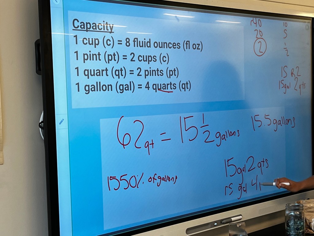 Fifth graders are working on measurement conversions, e.g. how many centimeters is 13.4 meters, or how many tons are equivalent to 4500 lbs? I can get excited about most mathematical topics K-8, but some of these measurement lessons require me to hype myself up on the way in. Maybe a kid will come up with an interesting visual representation! We can have some conversations involving estimation, and reasoning about whether a product will increase or decrease! I heard the classroom teacher created anchor charts with insta-worthy aesthetics! Maybe the endless pages of equations won’t lull this particular cohort of kids into a mathematical stupor!