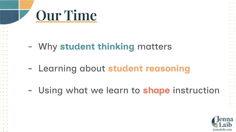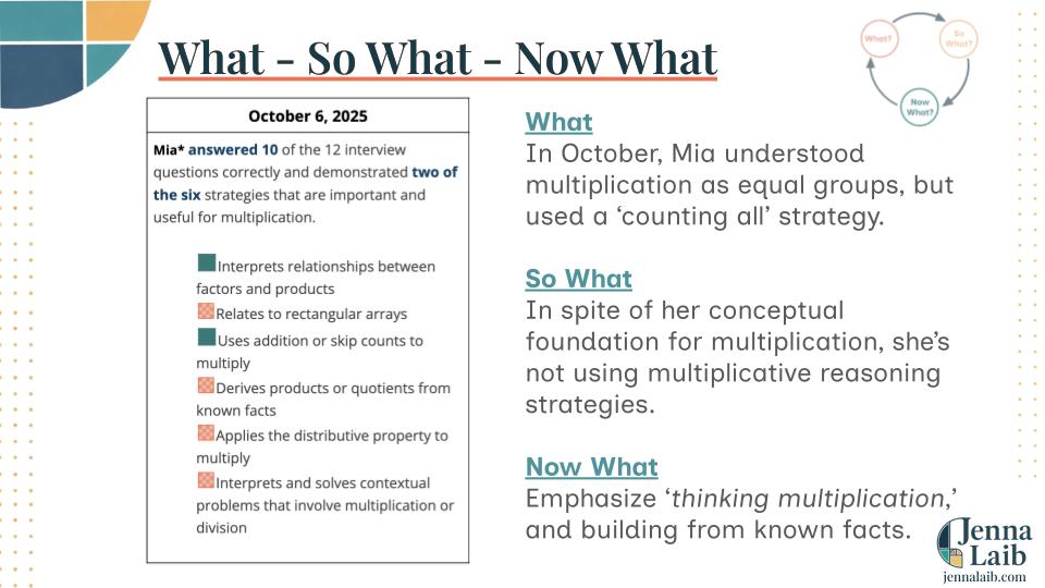 To prepare for the talk, I pored over information that I’ve gathered about students: scanned student work, reports from clinical interviews, etc. There are times when I assess students and have a clear sense of what to do next — and times when I finish an assessment only to slump in my chair, wondering where to go from here. I hoped to speak to teachers who had been there more than once: buried in data, staring at student work, still unsure how to plan for the next day. What do we need to do most urgently… cut through the noise? Organize our thoughts? Procure a stronger cup of coffee?