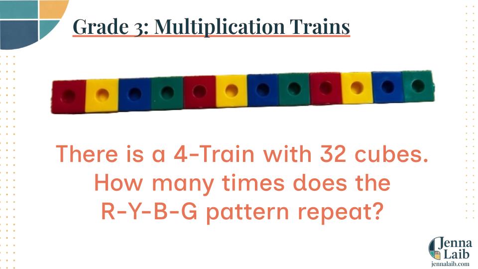 They follow repeating color patterns. We had asked students questions like, “How many cubes long is the RBG train that has four green cubes? …ten?”