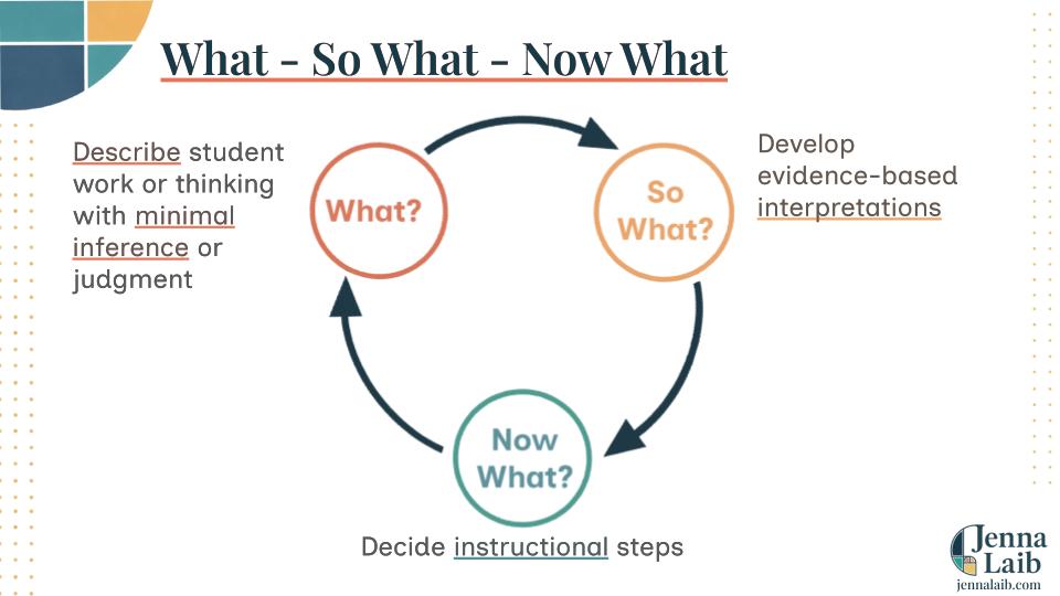 This mirrors some “looking at student work” protocols that I have used with teachers in the past. It’s condensed, but recognizably the same bones. Those protocols are genuinely valuable, and they take time for good reason: developing the muscle of making low-inference observations requires real work and practice. It’s so easy to jump to conclusions! But I wanted to offer something that works on a smaller scale, with fewer steps and layers.